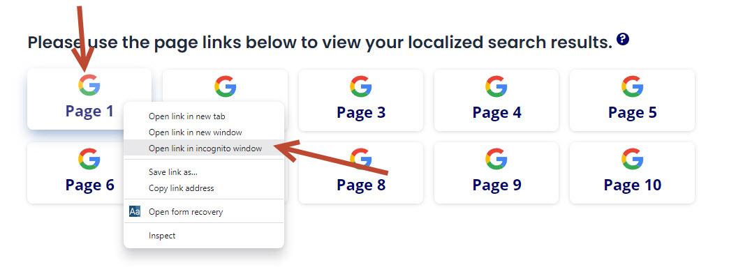 When you get to the next page it will give you a list of links to the page results. Open these links by right clicking and selecting “Open link in incognito window” (In Firefox incognito is referred to as a “private” window). This is an important step because it masks our personal information. If we did not mask our information, Google would take it into consideration when delivering results.